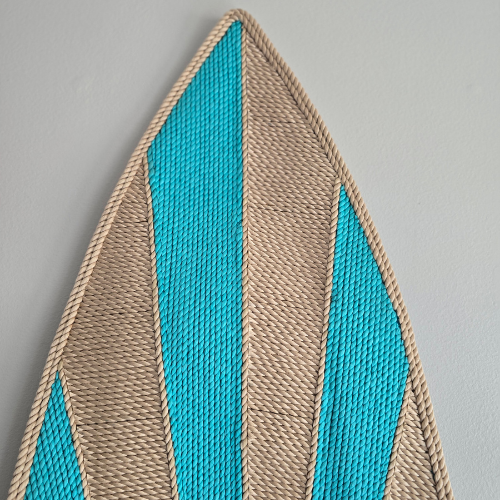 Handcrafted from Nomadic State of Mind’s signature rope, this surfboard-shaped rug features bold turquoise rays bursting outward from the center across a natural sand-colored field. The pattern feels like a moment frozen in time — that instant when the ocean catches the light and everything starts to glow.